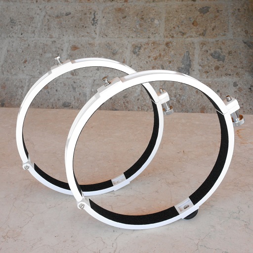 COPPIA ANELLI SUPPORTI MASSICCI AD ANELLI PER TUBI OTTICI O OBIETTIVI max Ø285 mm, APRIBILE CON VITE DI SERRAGGIO E BASE FORATA X FISSAGGIO A MONTATURE O PIASTRE.